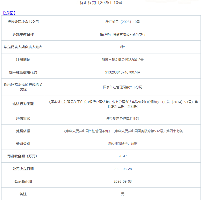 9月3日,国家外汇管理局江苏省分局官网更新行政处罚信息显示,招商银行股份有限公司新沂支行因“违反规定办理结汇业务”的违法事实,被国家外汇管理局徐州市分局处以“没收违法所得,罚款”的行政处罚,罚没款金额为20.47万元。