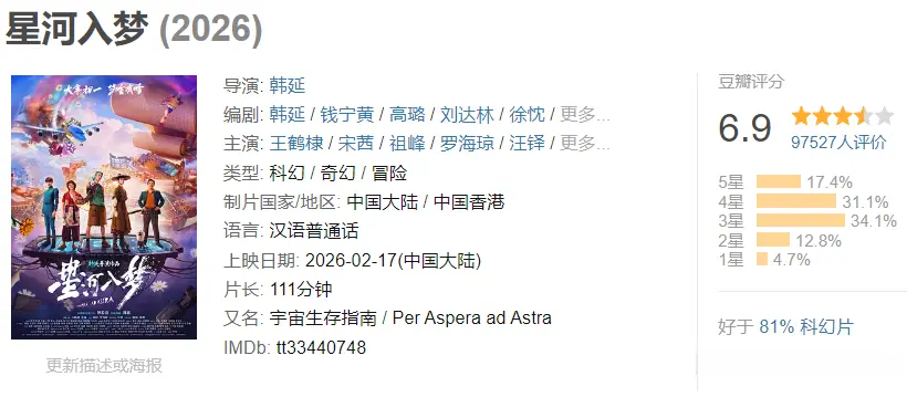 也正因此,《星河入梦》号称“适合年轻人的科幻爽片”,它的观众口碑也不错,评分达到了6.9分,远高于张艺谋导演的《惊蛰无声》。